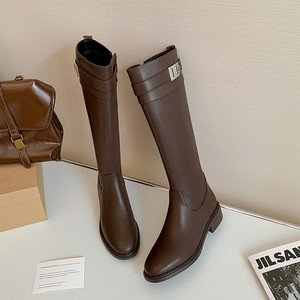 2025新款牛皮靴子女秋冬圆头中跟高筒靴大码靴粗腿女骑士靴