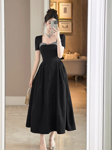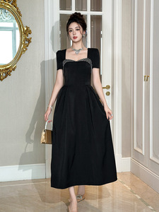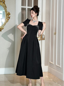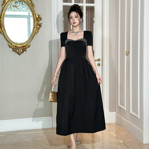2025夏季新款女装重工设计感镶钻收腰大摆连衣裙赫本风长裙9053