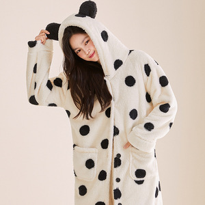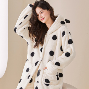 300G连帽睡衣女冬季珊瑚绒黑色纽扣加绒加厚长款可爱家居服两件套
