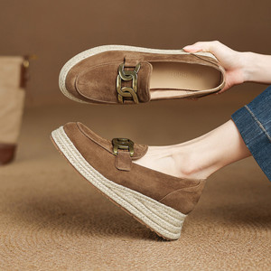 5cm~新款真皮单鞋女坡跟草编渔夫鞋复古一脚蹬厚底乐福鞋休闲鞋
