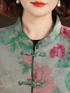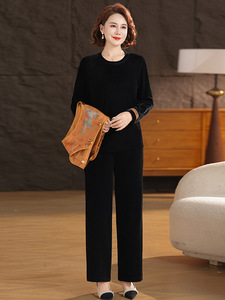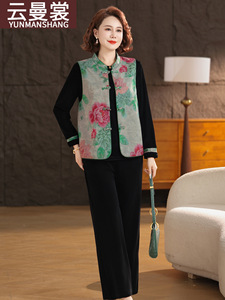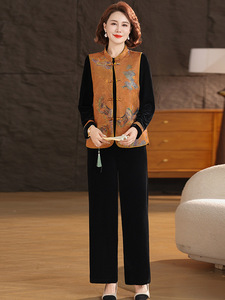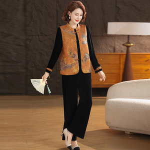 中年妈妈秋装时尚洋气金丝绒套装中老年女装新中式印花国风三件套