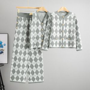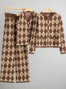 跨境欧洲站时尚洋气千鸟格条纹字母提花针织三件套圆领显瘦开衫