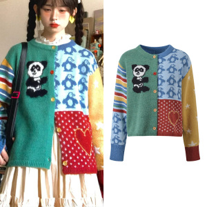 2025秋季新款慵懒风撞色熊猫趣味提花宽松百搭针织开衫上衣外套