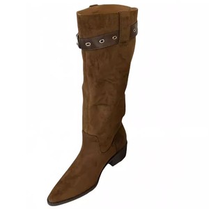 牛皮版褶皱堆堆靴子女牛仔靴尖头粗跟显瘦不过膝长靴辣妹风骑士靴