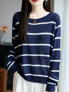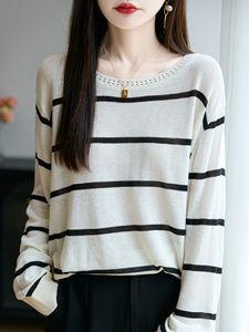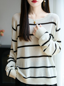 2025年早秋新款精纺羊毛圆领针织衫长袖女拼色条纹镂空打底衫上衣