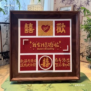 【大尺寸外框37*37cm】-胡桃色外框-大喜新婚快乐肌理画套装