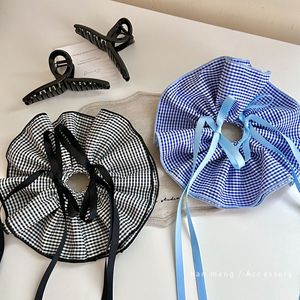 韩系蓝色蝴蝶结飘带格子抓夹高级后脑勺鲨鱼发夹大号发量发卡发饰
