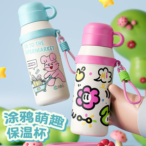 涂鸦双饮保温杯高颜值学生不锈钢便携上学卡通随行吸管水杯子