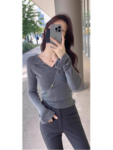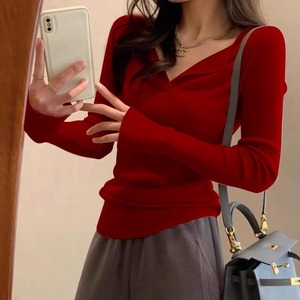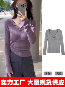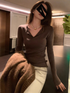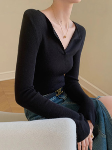 包芯纱面料 法式复古v领针织打底衫秋冬内搭毛衣气质紧身长袖上衣