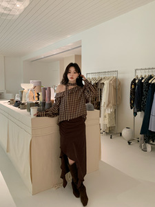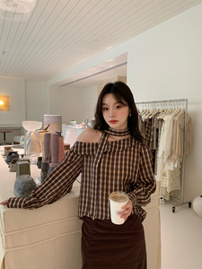 诠释美 NEWOPEN 25秋复古法式荷叶边斜肩长袖套头格子衬衫女F6072