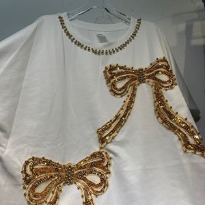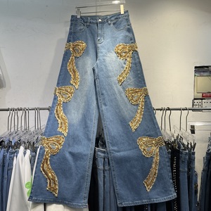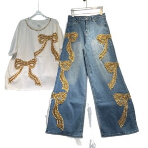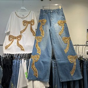高级感蝴蝶结亮片刺绣白色上衣t恤秋季重工钉珠直筒阔腿牛仔裤