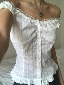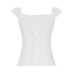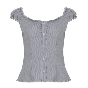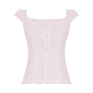 欧美跨境法式小清新甜美木耳边拼接纯色排扣收腰显瘦衬衫短袖T恤