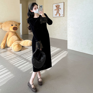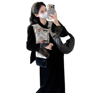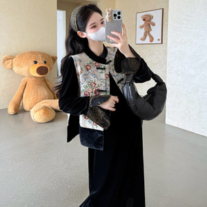 孕妇秋季新款新中式国风盘扣马甲+丝绒打底连衣裙甜美时尚两件套