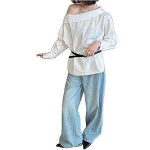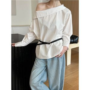 藏青色一字肩露肩爆款2025欧货衬衫女法式掐腰衬衣解构老钱风上衣