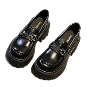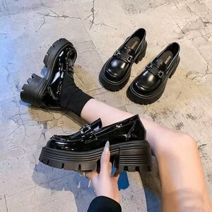 2025秋季亮皮厚底乐福鞋女增高新款金属水钻松糕单鞋英伦风小皮鞋