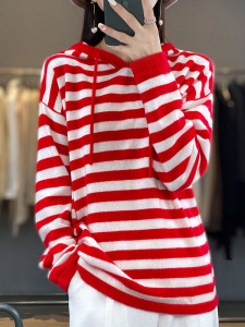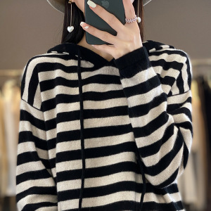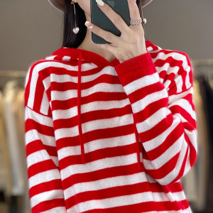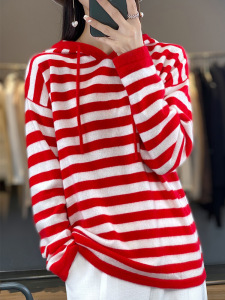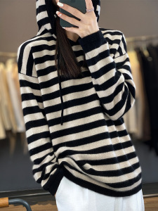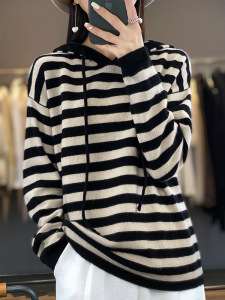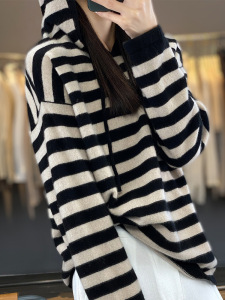 25年秋冬新款100羊毛连帽针织衫长袖女拼色条纹宽松套头打底衫