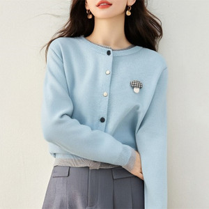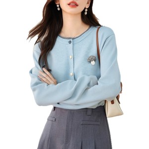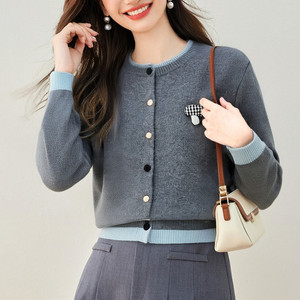 2025春季新款气质小香风圆领短款毛衣时尚上衣撞色假两件开衫外套