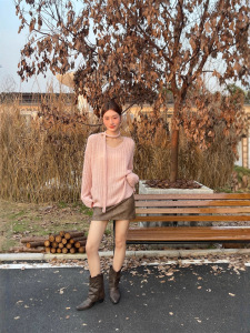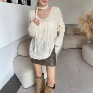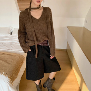 【实拍】飘带羊毛针织衫V领毛衣女宽松气质上衣春秋季薄款慵懒风