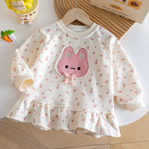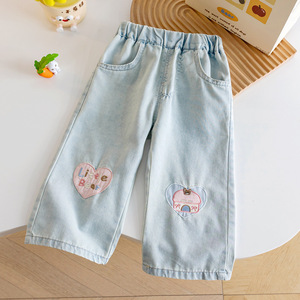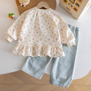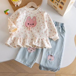 小女孩秋季小香风卡通套装韩范新款碎花小兔卫衣+阔腿爱心牛仔裤