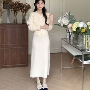 气质小香风毛衣两件套女秋冬新款重工钉珠高腰半身裙显瘦针织套装