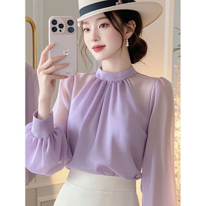 早秋新款韩系别致2025新款通勤雪纺上衣高级紫色衬衫女士打底衫