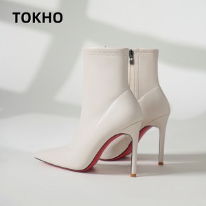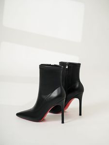 红底版皮靴~新款黑色高跟短靴女靴细跟百搭中筒加绒弹力时装靴