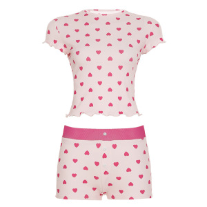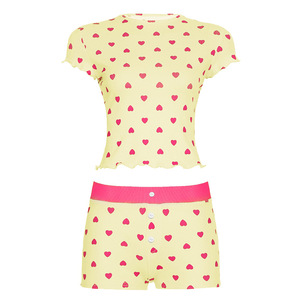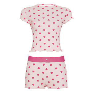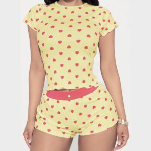 2025夏季欧美外贸女装休闲家居爱心印花撞色基础简约短袖短裤套装