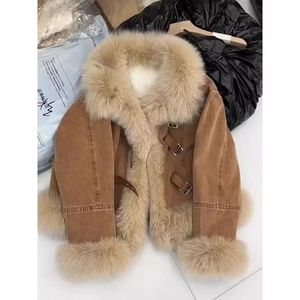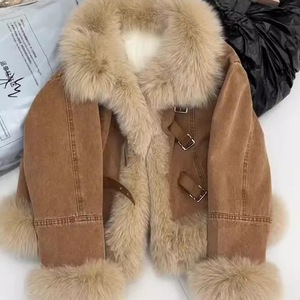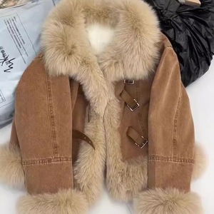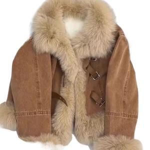 韩系设计毛领复古棕色牛仔外套时尚夹绒加绒加厚保暖仿皮毛绒大衣