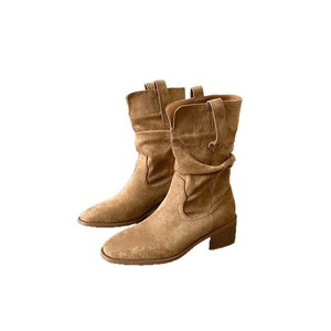复古西部靴2025秋冬新款圆头牛翻皮褶皱女靴粗跟中筒靴堆堆靴女