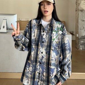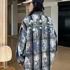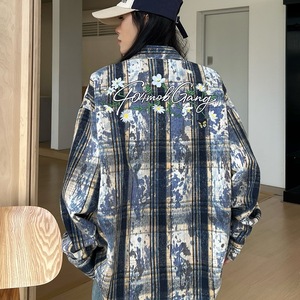 渝宝同款404MOB美式扎染花卉刺绣长袖衬衫男磨毛加厚情侣外套男女