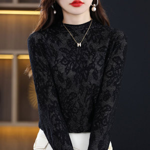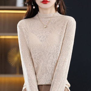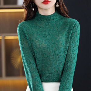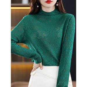 半高领蕾丝镂空长袖针织打底衫女25秋冬新款韩版精仿羊毛内搭上衣
