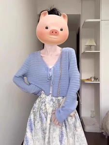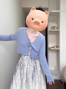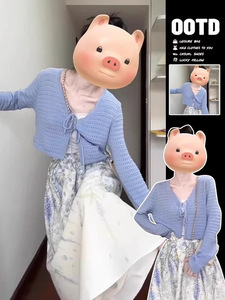 一整套初秋穿搭奶系温柔风蓝色镂空针织衫别致气质半身裙3件套女