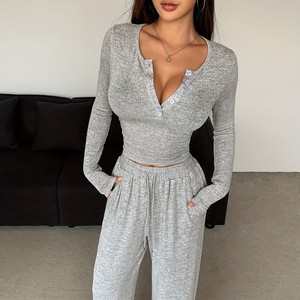 2025欧美跨境四季可穿新款套装长袖连扣式纯色紧身上衣加长裤两件
