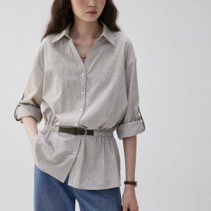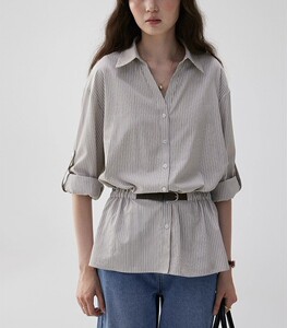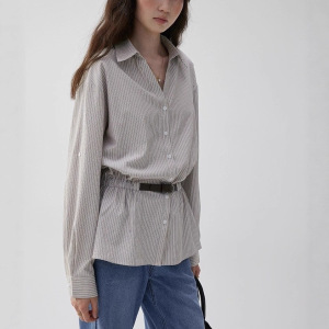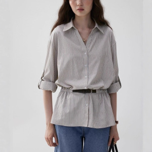 芥末派VOOE设计V领收腰条纹宽松衬衫女早秋新款气质通勤上衣