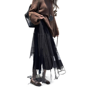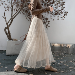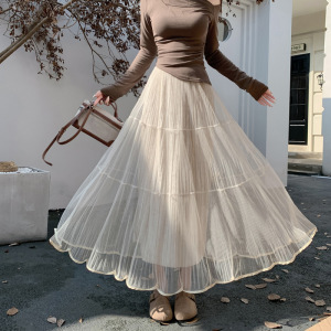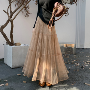 韩系蓬松纱裙秋冬新款时尚显瘦松紧腰网纱金丝绒A字裙女