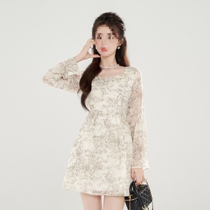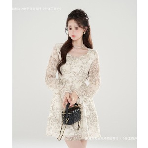 2025秋季法式气质碎花裙荷叶边显瘦雪纺字裙子感方领连衣裙