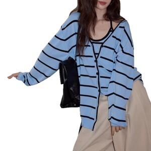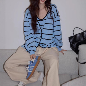 吵吵1家韩系蓝色条纹毛衣女2025秋慵懒宽松休闲长袖针织衫外搭上
