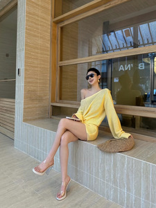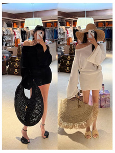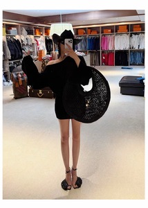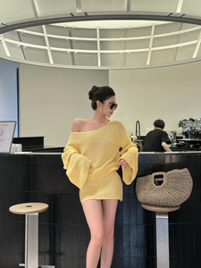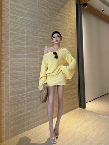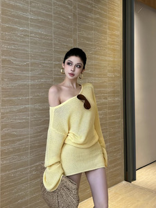 休闲慵懒质感 斜肩套头宽松薄款针织镂空长袖纯色连衣裙收腰短裙