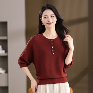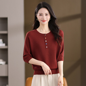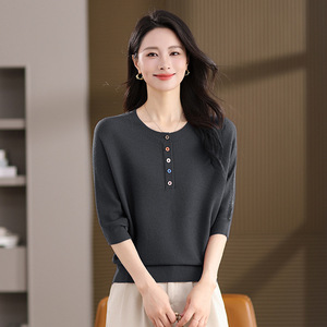 2025春秋新款圆领针织衫七分袖T恤女纯色彩扣套头百搭打底衫上衣