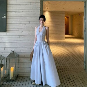 挂脖长裙新款显瘦镂空拼接蕾丝条纹挂脖长款连衣裙女夏季