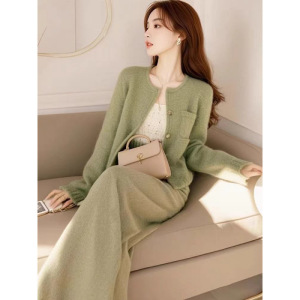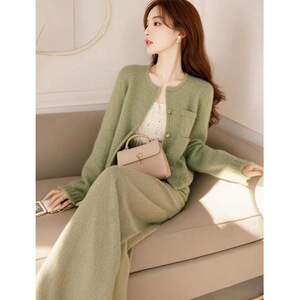 气质女神范高端绿色小香风针织外套裤子套装春秋穿搭一整套高级感