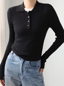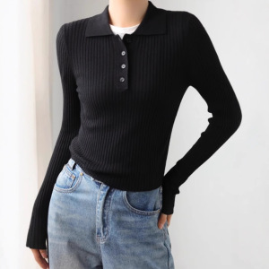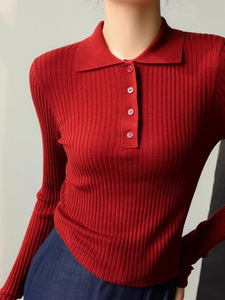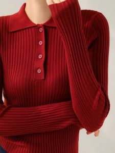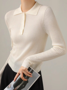 法式复古POLO领羊毛长袖针织衫女2025春修身套头内搭打底毛衣灰色