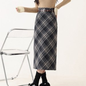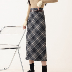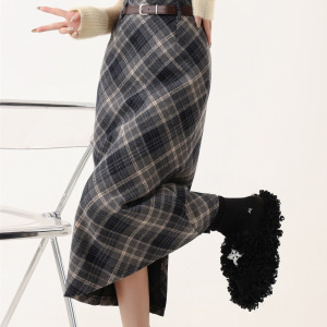 加厚毛呢格子半身裙女大码春秋配毛衣高腰显瘦开叉直筒包臀长裙子
