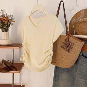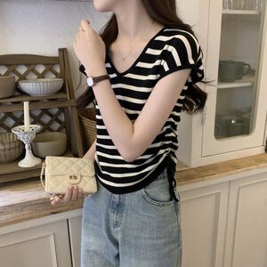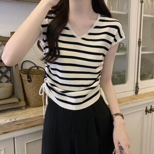 独特设计感小众抽绳针织短袖女装夏季条纹V领洋气正肩显瘦T恤上衣