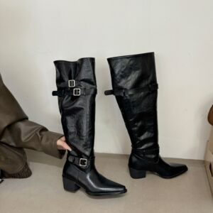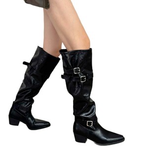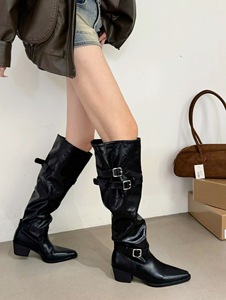尖头粗跟高跟漆皮长筒靴女2025秋冬季新款堆堆靴子显瘦西部骑士靴