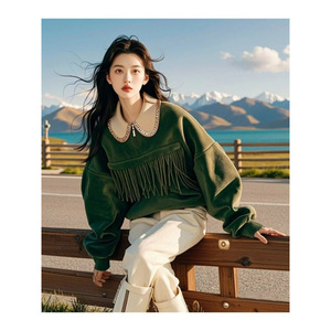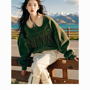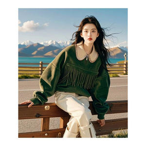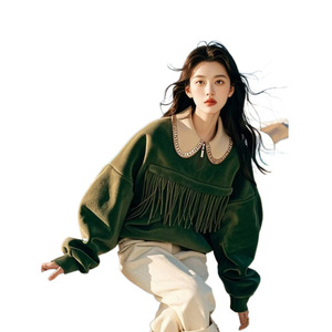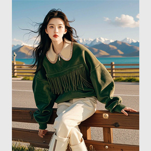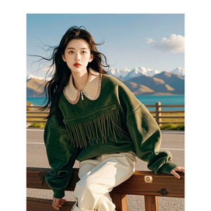 年秋冬新款上衣小众洋气时髦宽松绿色娃娃领丝绒卫衣