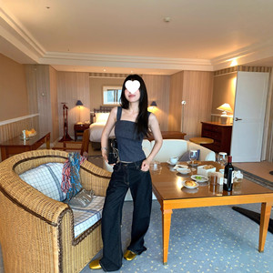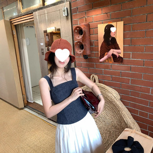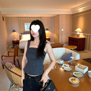 MS jennie的木棉+再生纤维复古蓝显身材方领吊带亲肤上衣