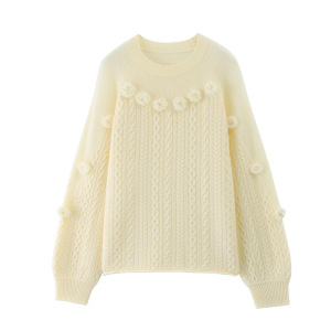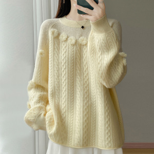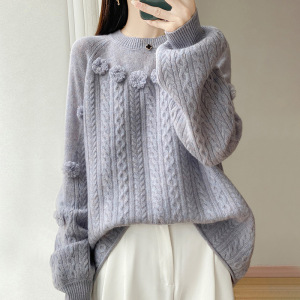 双股加厚手工绣花100羊毛衫女秋冬新款圆领麻花提花宽松羊绒上衣