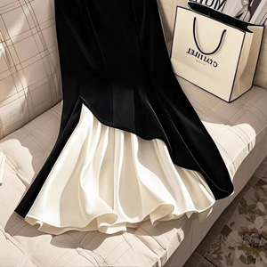 安雁流行爆款高级感独特超好看黑色丝绒拼接高腰a字半身裙秋冬季