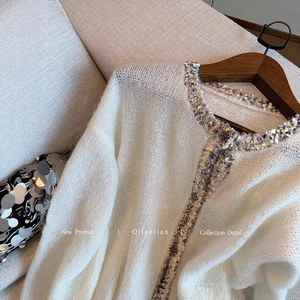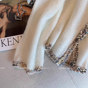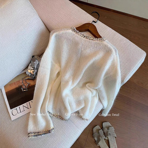 小香风拼接撞色马海毛针织开衫女秋冬新款气质慵懒风软糯毛衣外套